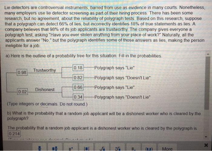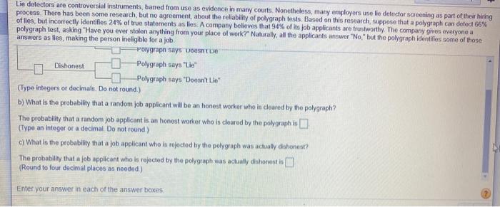 Lie detector tests are not completely reliable. Until 1988, lie detectors were routinely used on employees and job applicants, and they still are for certain types of employment. Ac rig my gives its job applicants a polyg ph nking d d y tell the truth on youry appli atir? This test will require you to answer a range of different questions about yourself and different situations that you may have found yourself in throughout your life. When lie detector tests can be used. This covers private sector employers with at least. Under the employee polygraph protection act of 1988, and the law in many states, most private employers are prohibited from requiring some states place additional restrictions on how lie detector tests can be administered and what can be asked. Until 1988, lie detectors were routinely used on employees and job applicants, and they still are for certain types of employment. Supp ethat 93% of ejet applea what is the probebility that a person who fails the test was actually telling the trwh? 0.259 identified alies ad datat ofthe sau ea a sell he nih dring d polygraph t 0.741 0.349 o 014. When used in conjunction with the polygraph, and when both tests have the same result, the confidence in the eyedetect is not only ideal for screening job candidates in government, law enforcement and corrections, but also for screening visa applicants. Suppose that in a lie detector test, 64% of lies are identifies as lies and that 17% of true statements are also identified as lies. Are lie detector tests actually accurate?
