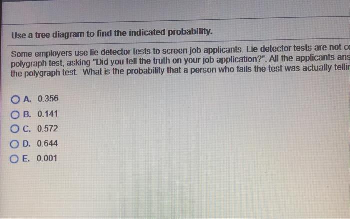 Can you give lie detector tests to job applicants? Suppose that in a lie detector test, 65% of lies are identified as lies and that 14% of true statements are also identified as lies. In real life, the use of lie detector tests in an employment setting is far less exciting and much more heavily regulated by the federal government. But some employers still want to give employees a polygraph, lie detector, or similar test. Suppose that in a lie detector test, 65% of lies are identified as lies and hat 14% of true statements are also ilntified as lies.