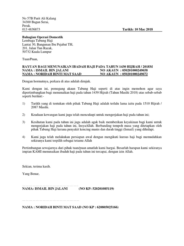 Selasa, 11 mei 2021 tambah komentar edit. Anda telah mengemukakan rayuan dengan tabung haji untuk menunaikan haji pada tahun tersebut. Dengan segala hormatnya, perkara di atas dirujuk. Boleh jadi giliran anda pada asalnya ialah tahun 2048, tapi pada tahun 2018 anda sudah berjaya mendapatkan giliran setelah membuat rayuan. Pihak th akan mengeluarkan surat perakuan. Bangunan ibu pejabat tabung haji, 201 jalan tun razak (5,604.84 mi) kuala lumpur, malaysia, 50450. Semoga pihak tabung haji dapat menunaikan rayuan saya yang tersebut di atas. Hati hati jika disapa di depan tabung haji oh media. Tempoh tabung haji akan terima surat rayuan kita biasanya bermula november sehingga bulan rejab sahaja. Cimb islamic provides the facility for you to perform any transaction with your tabung haji account at any cimb's 2,970 self service terminals nationwide today. Lembaga tabung haji lantai 30, bangunan ibu pejabat tabung haji 201 jalan tun razak 50732 kuala lumpur. Cara buat rayuan mengerjakan haji melalui pengisian borang secara manual seperti sedia maklum, tabung haji akan mengatur giliran jemaah haji berdasarkan mereka yang telah mendaftar haji terlebih dahulu khusus bagi pakej. Pihak tabung haji akan mengeluarkan surat perakuan penerimaan rayuan haji pada tahun semasa kepada mereka dan seterusnya rayuan tersebut dimasukkan ke dalam sistem untuk diproses.