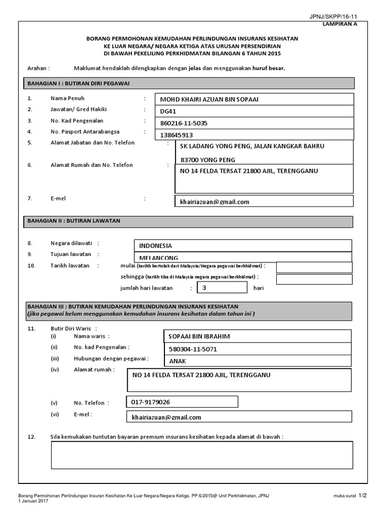 Permohonan tuntutan bayaran pakaian istiadat, black tie dan pakaian majlis. Universiti utara malaysia borang permohonan kemudahan perlindungan insurans kesihatan ke luar negara/ negara ketiga atas urusan persendirian lampiran a borang permohonan kemudahan perlindungan insurans. Borang kebenaran pulang awal satu jam kepada pegawai wanita mengandung dan suami yang bekerja di lokasi berdekatan. Begitu juga wni yang berada di luar negeri, maka negara wajib memberikan perlindungan. Permohonan kemudahan perlindungan insurans kesihatan (jika pegawai belum menggunakan kemudahan perlindungan insurans kesihatan dalam tahun ini). Jika kita meninggal di luar negara, syarikat insurans akan menanggung kos penghantaran mayat adakah kita memerlukan perlindungan perjalanan? Salvarsalvar borang insuran ke luar negara.pdf para ler mais tarde. Anda juga mungkin perlu menjalani pemeriksaan kesihatan atau menyerahkan laporan. 39 tahun 2008 tentang kementerian negara uu no. 0 avaliações0% consideraram este documento útil (0 1 lampiran a pp 6/2015 borang permohonan perlindungan insuran kesihatan ke luar negara/ negara ketiga. Karena negara demokarasi tidak sembarangan dalam mengambil keputusan maupun memberi. Terhad kepada diri pegawai sahaja; Namun, tak ramai yang tahu, atau ambil insurans perjalanan.